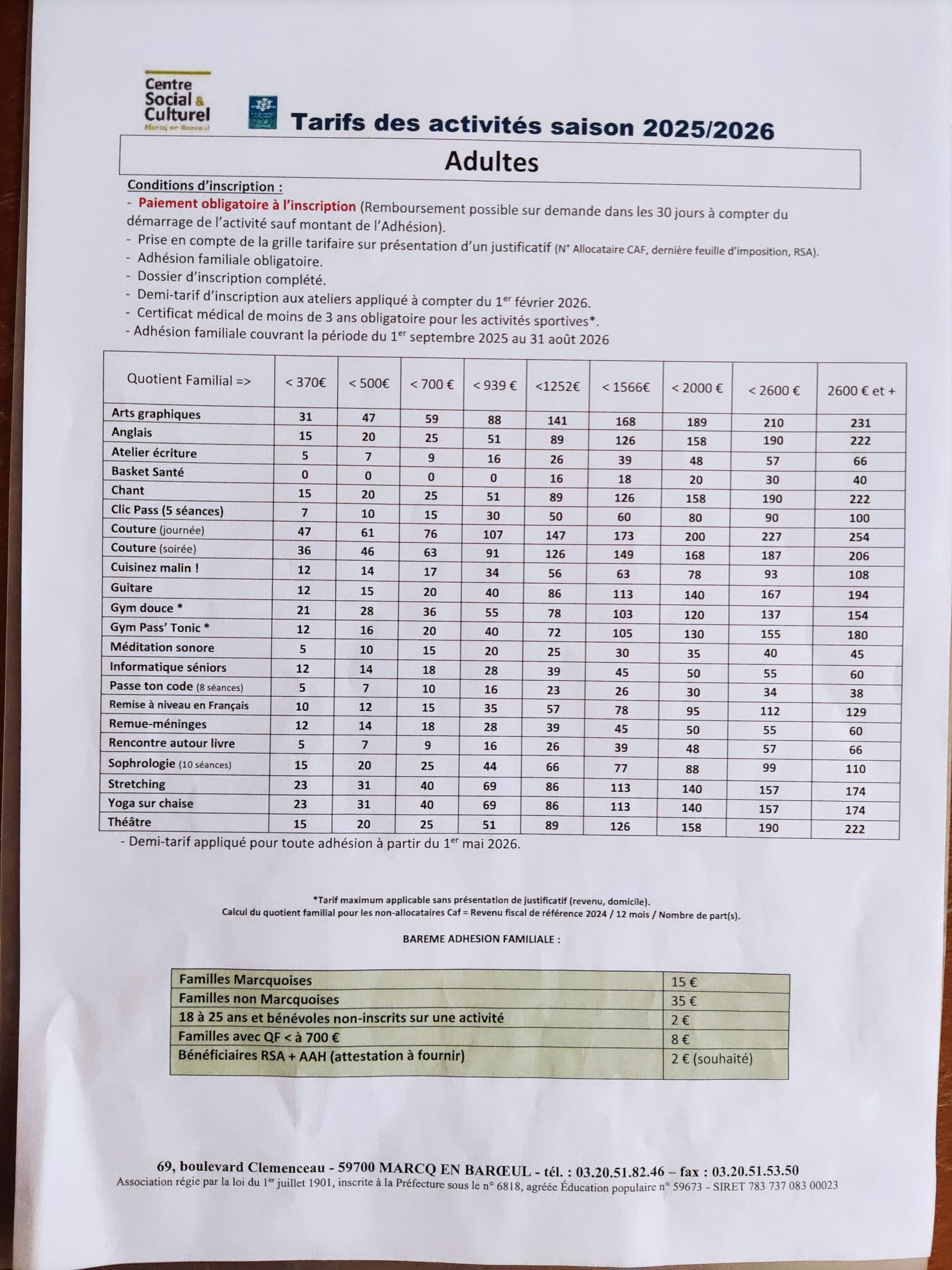 Vous devez adhérer au Centre Social & Culturel de Marcq en Baroeul  (voir tarifs ci-joints).